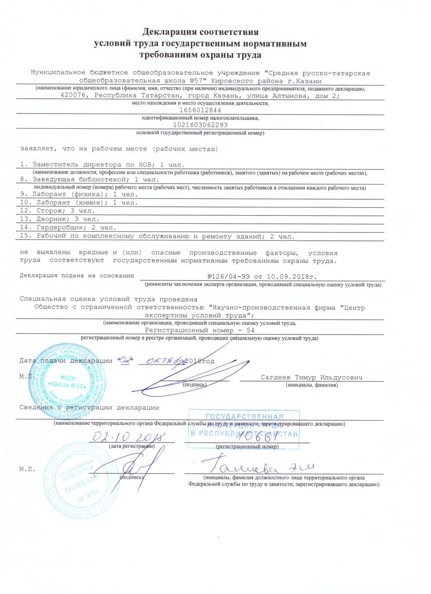 Декларация соответствия условий труда государственным нормативным требованиям охраны труда