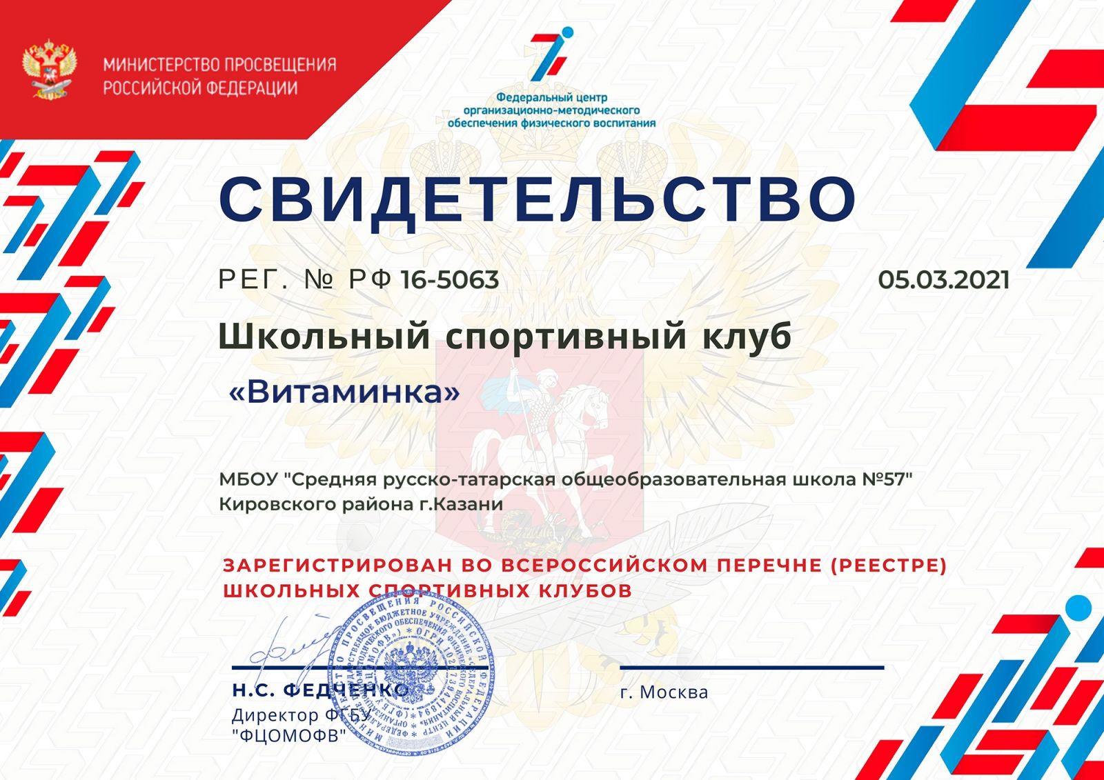 Свидетельство о регистрации в реестре школьных спортивных клубов