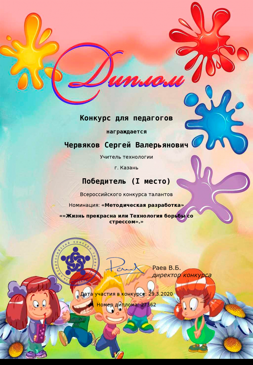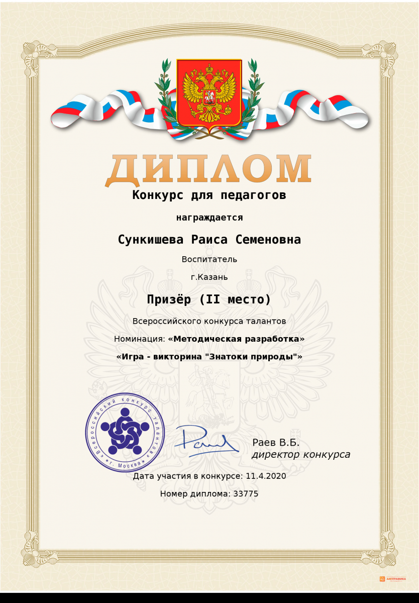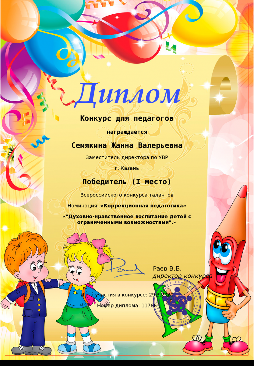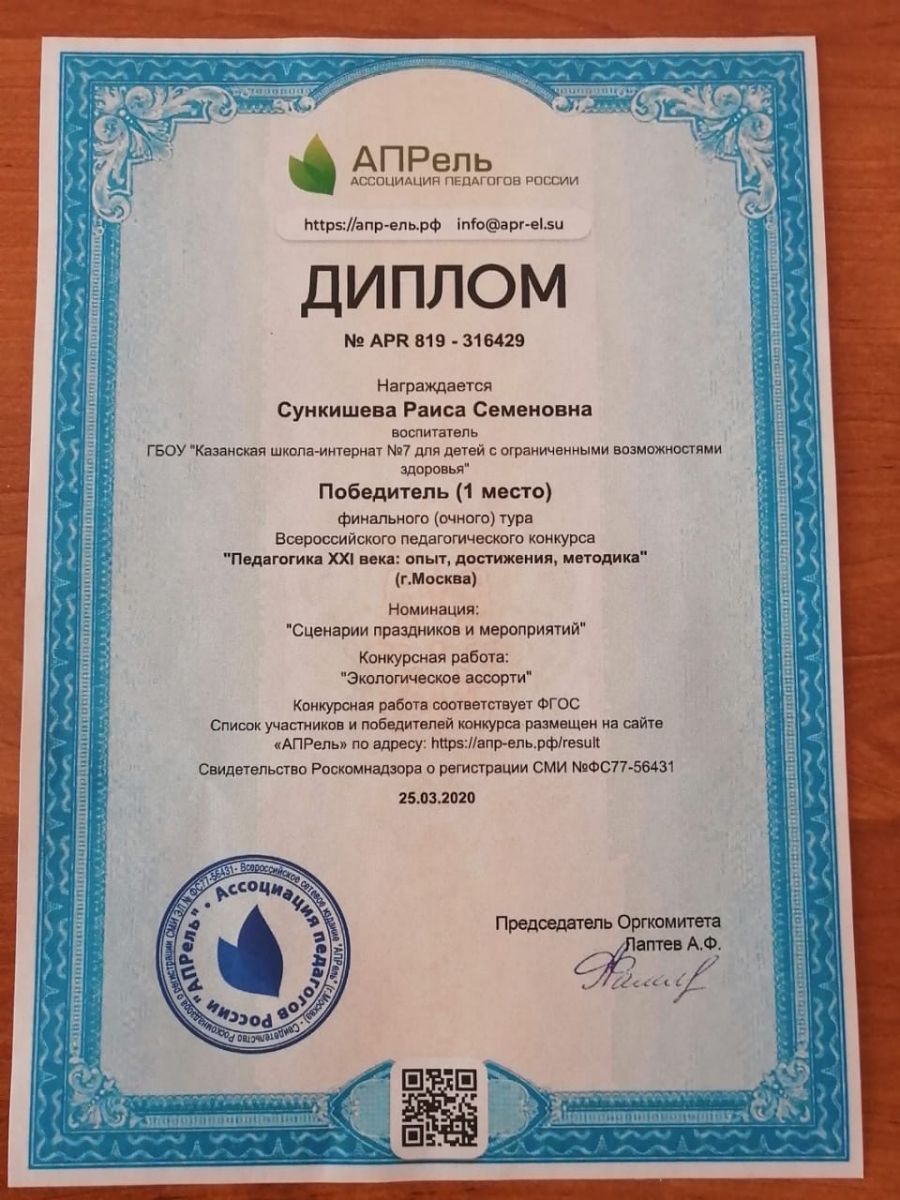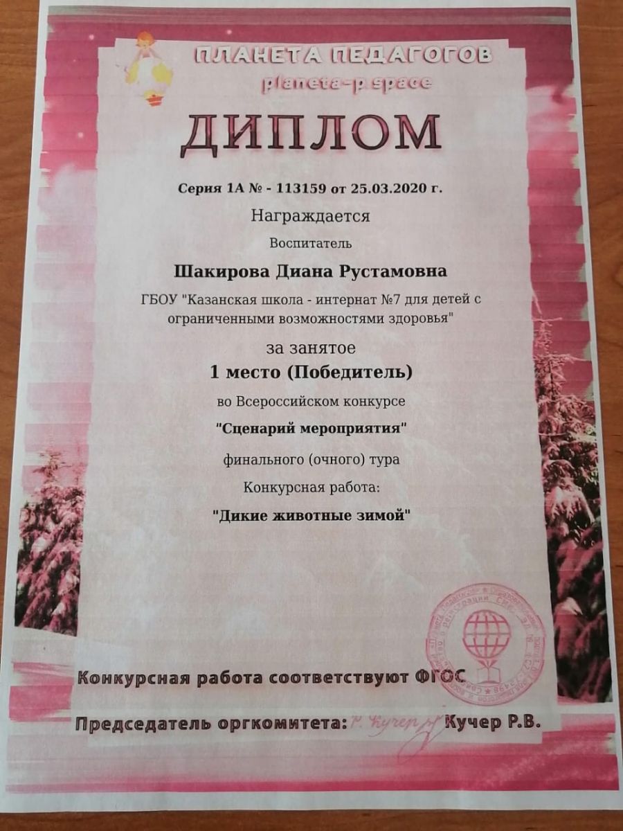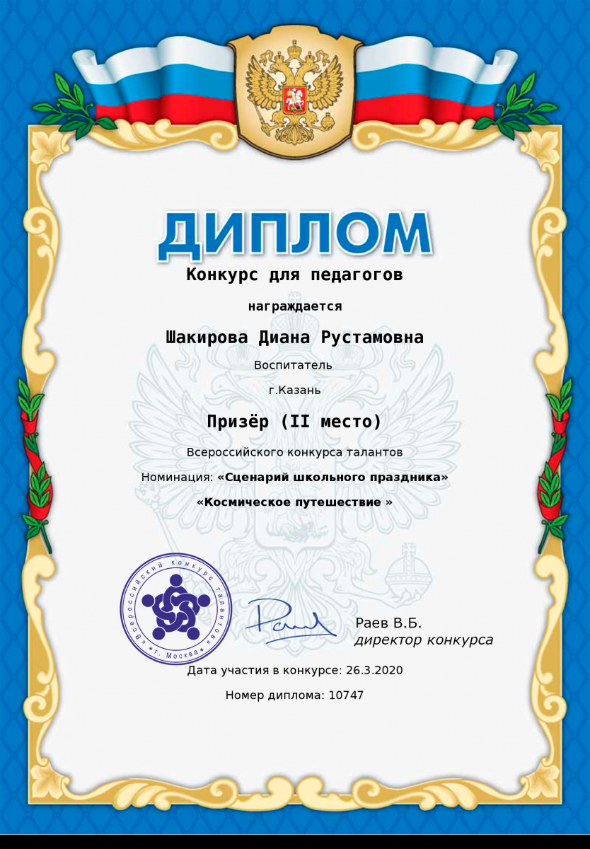 Диплом за 1 место во Всероссийском конкурсе "Сценарий мероприятия" Шакировой Дианы Рустамовны