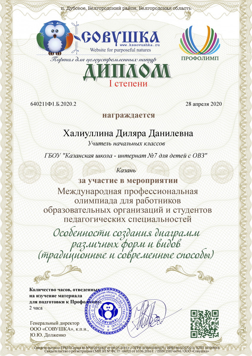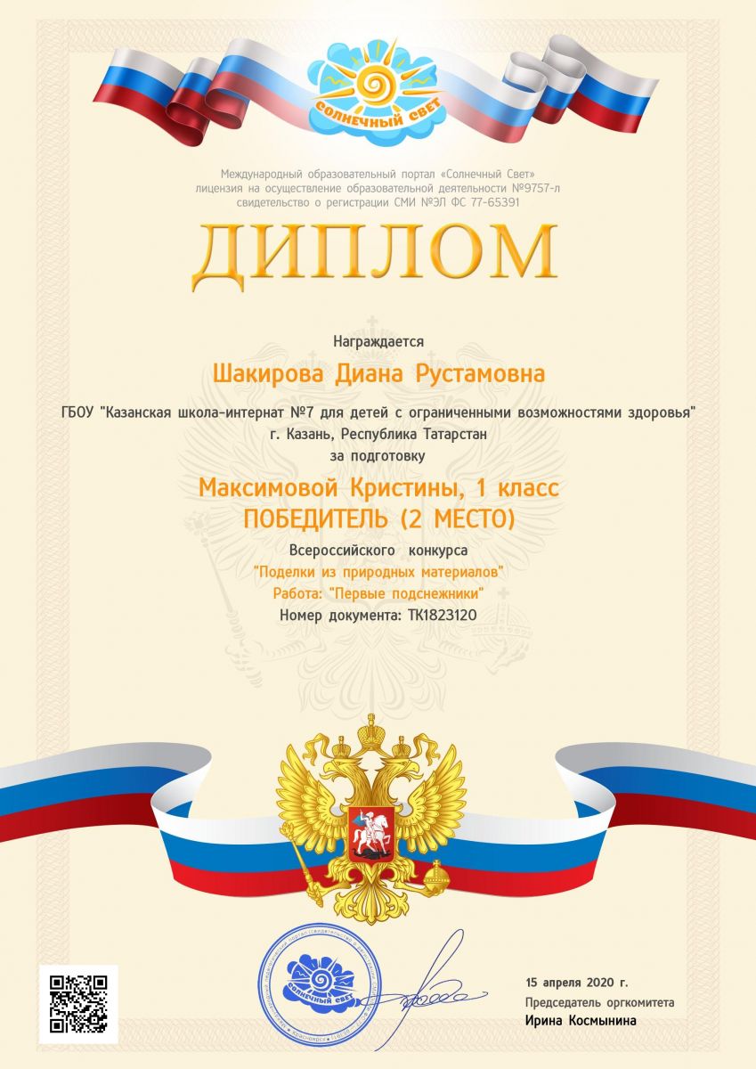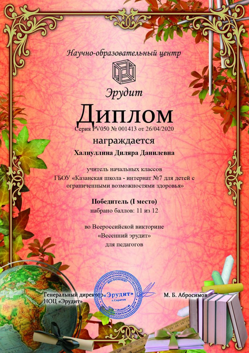 Диплом за 1 место во всероссийской викторине "Весенний эрудит" Халиуллиной Диляры Данилевны