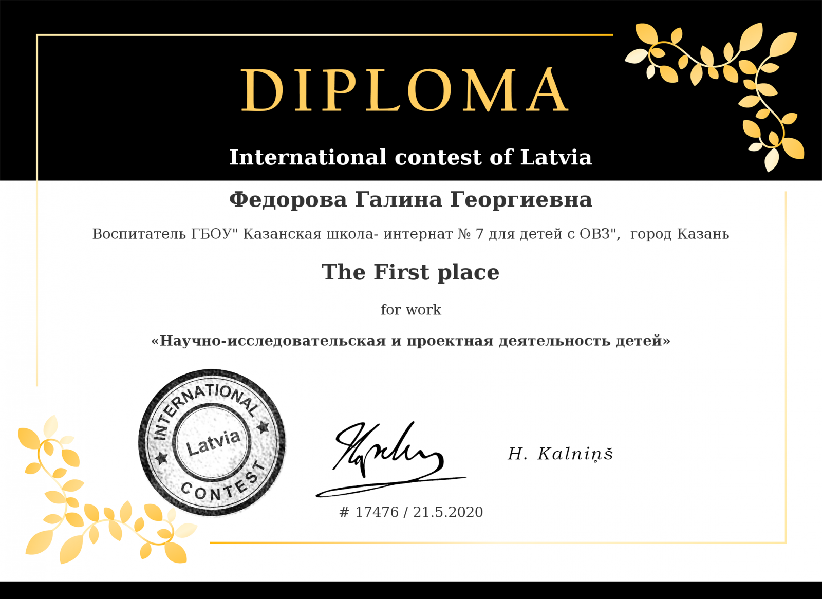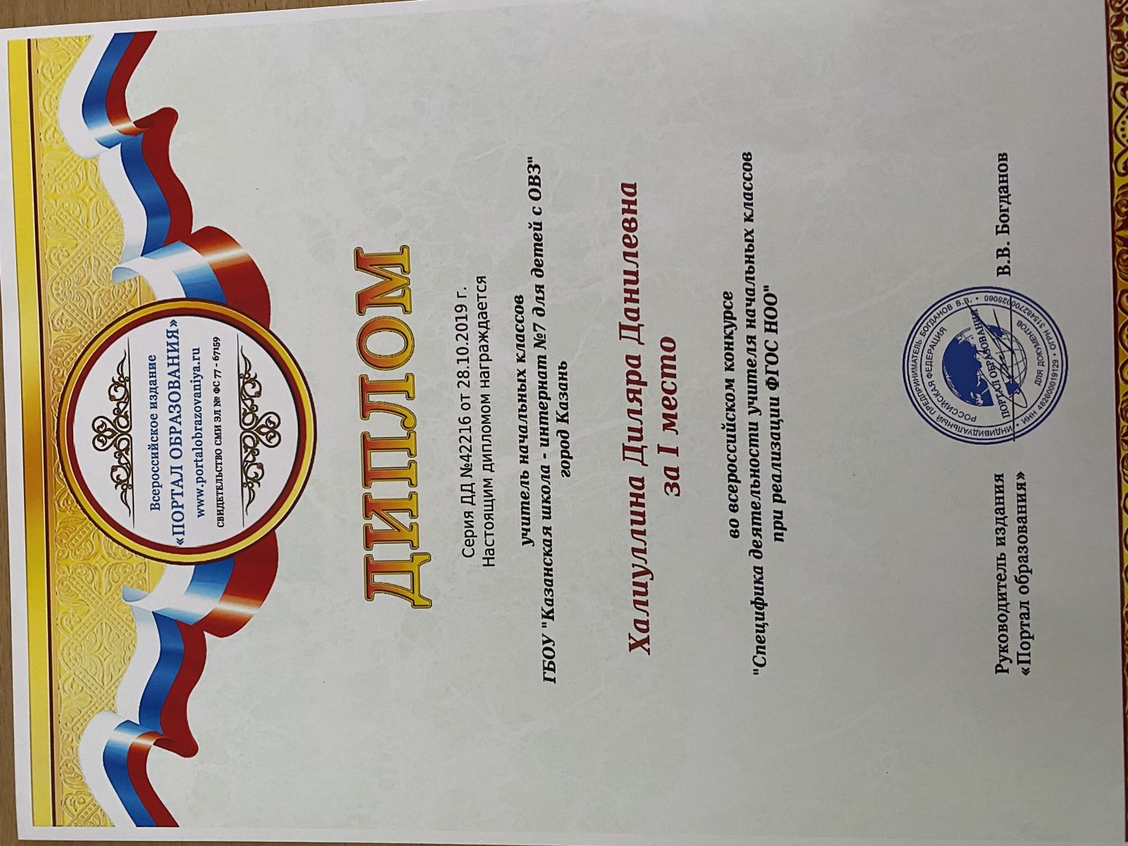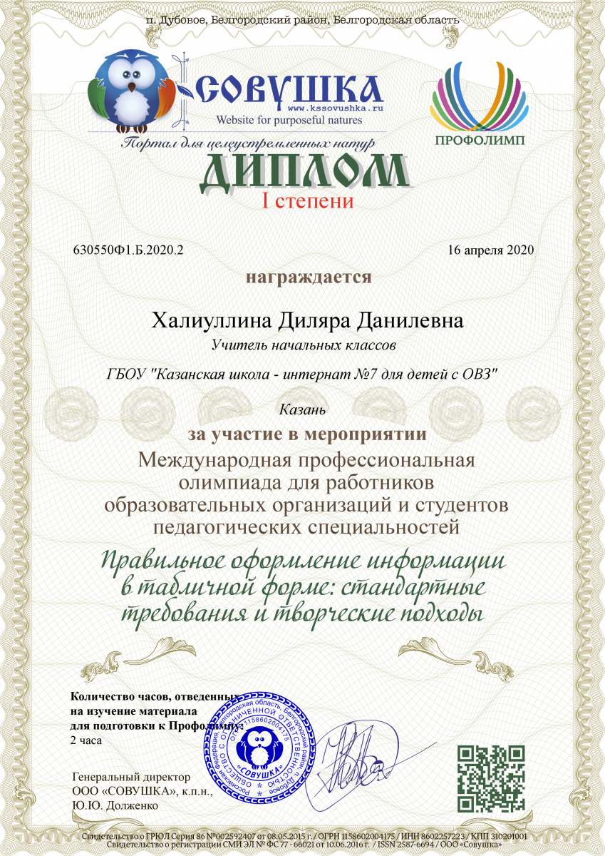 Диплом за 1 место во всероссийской викторине "Весенний эрудит" Халиуллиной Диляры Данилевны
