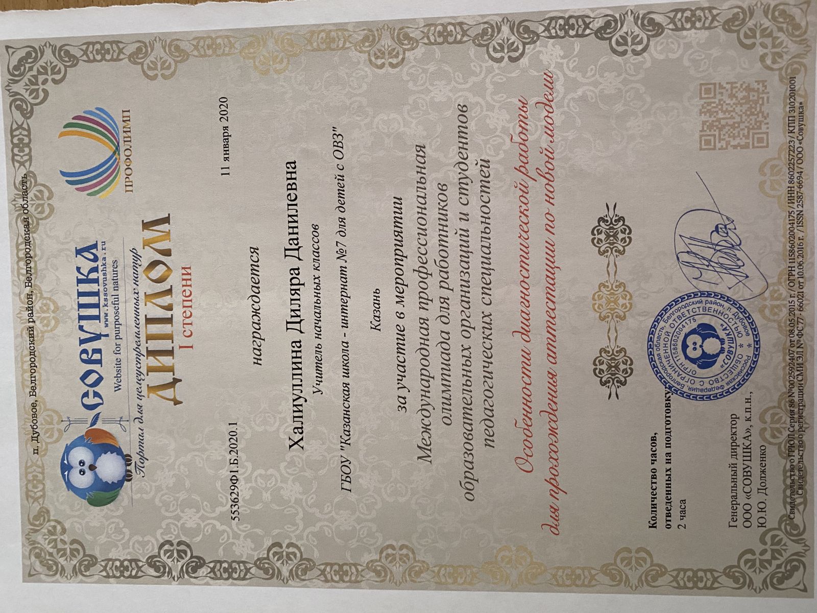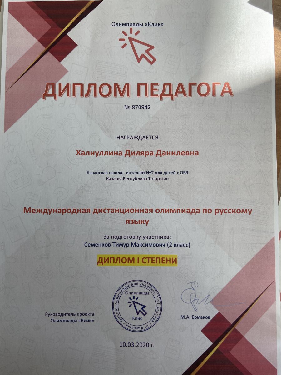 Диплом I степени педагога Халиуллиной Диляры Данилевны за подготовку ученика 2 класса Семенкова Тимура Максимовича по международной дистанционной олимпиаде по русскому языку