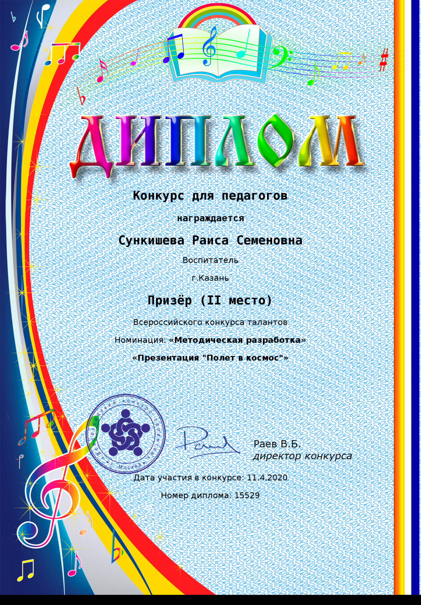 Диплом за 1 место в международном конкурсе "Космос" Насыбуллиной Людмилы Леонтьевны