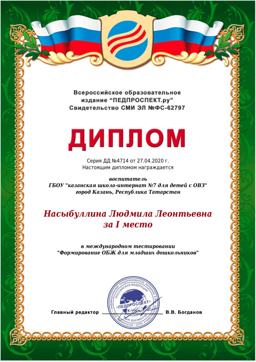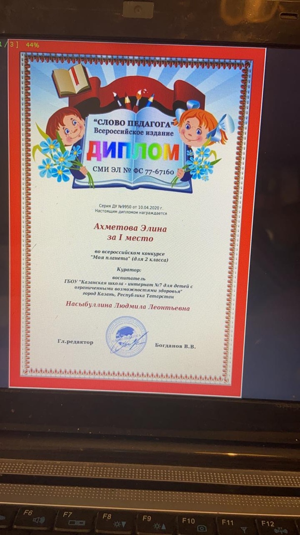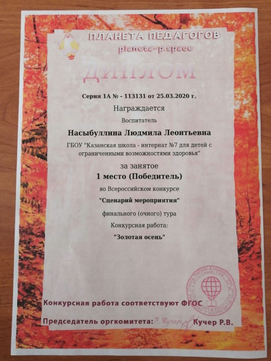 Диплом за 1 место в Всероссийском конкурсе "Моя планета" Насыбуллиной Людмилы Леонтьевны