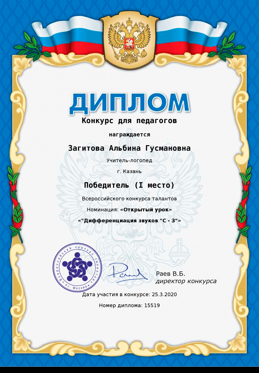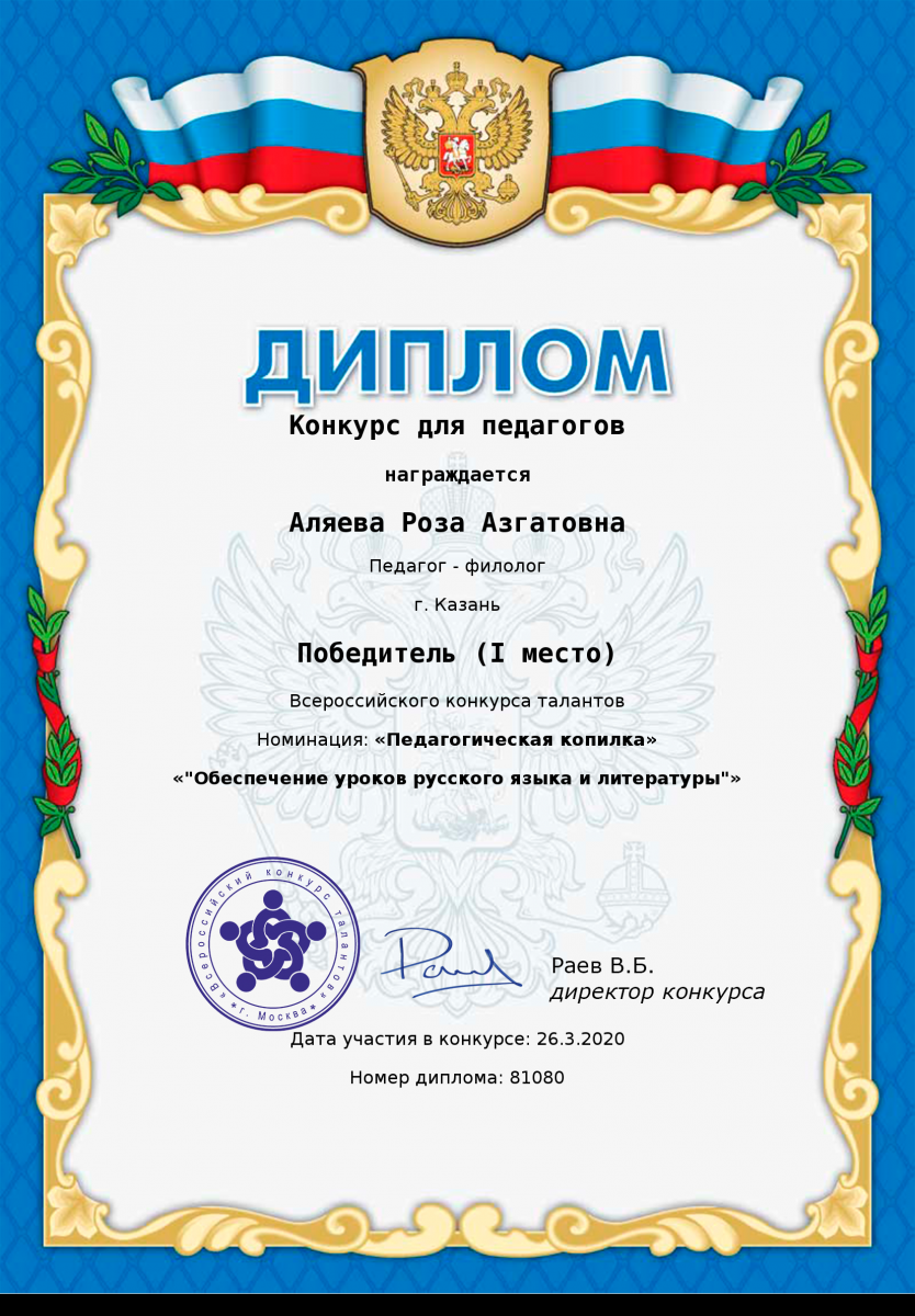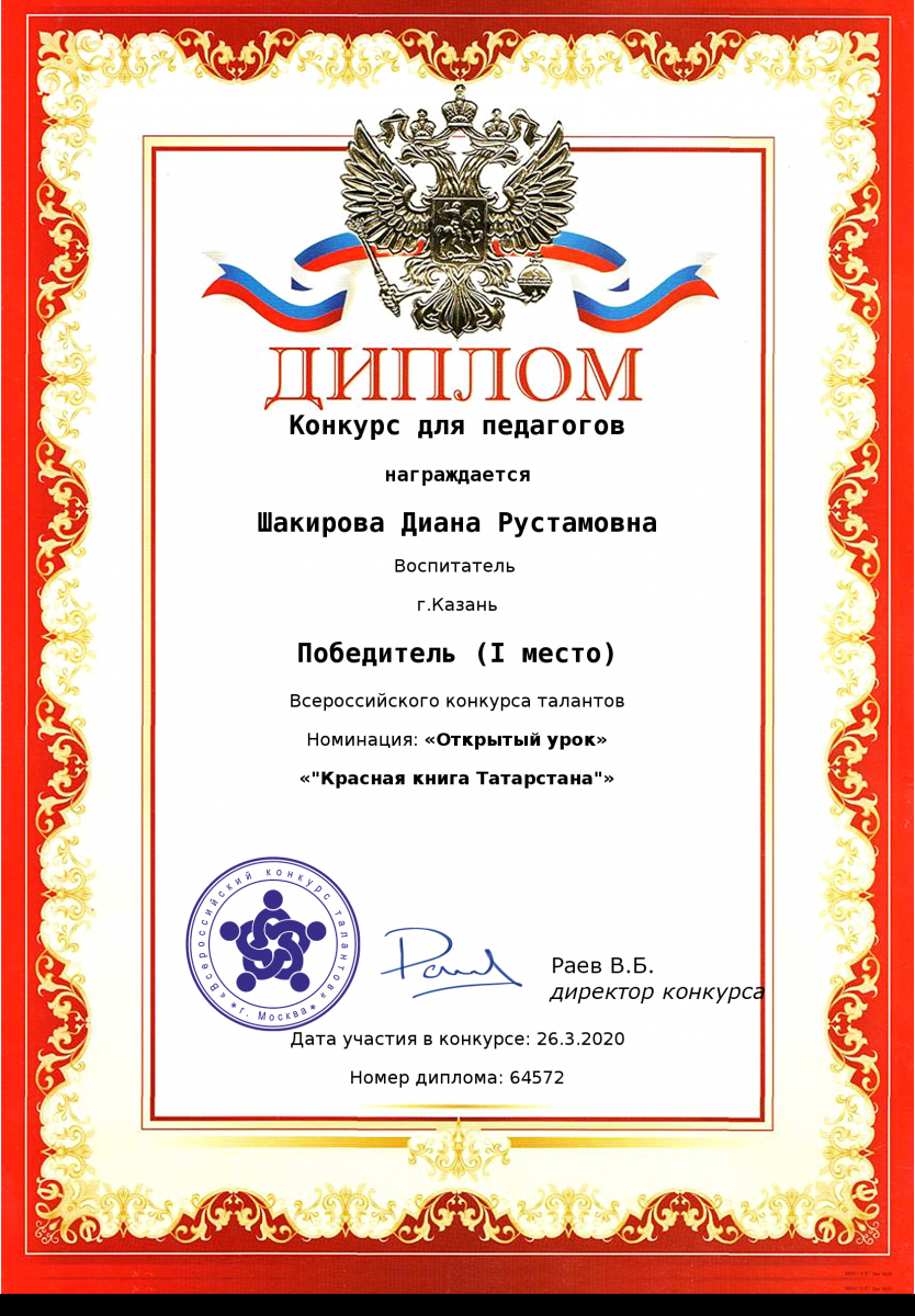 Диплом за 1 место во всероссийском конкурсе талантов "Открытый урок" Шакировой Дианы Рустамовны