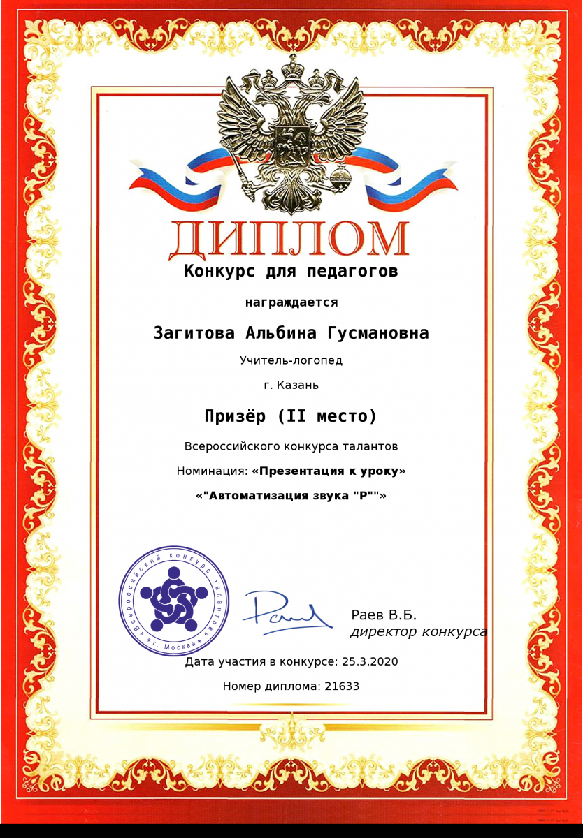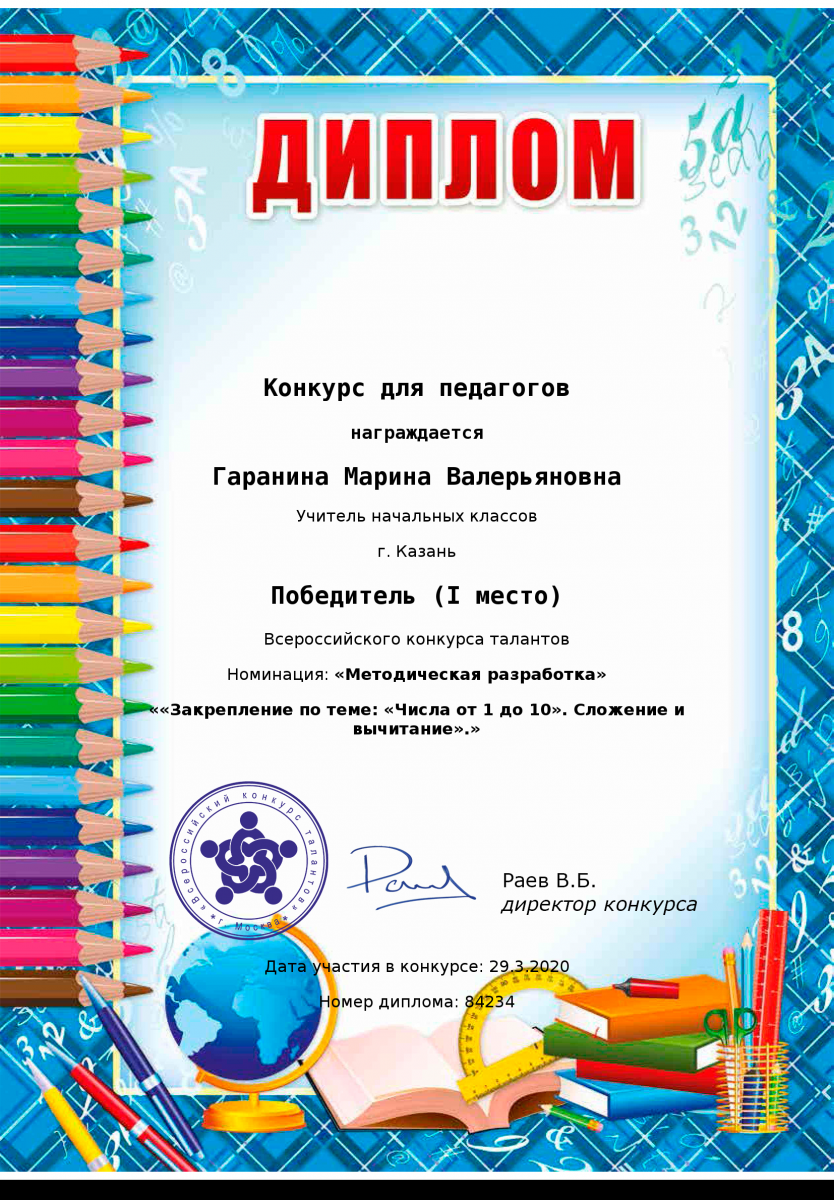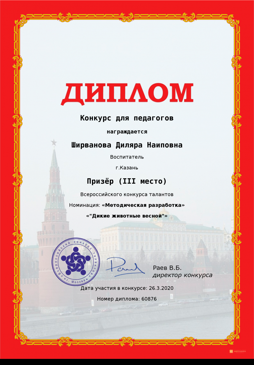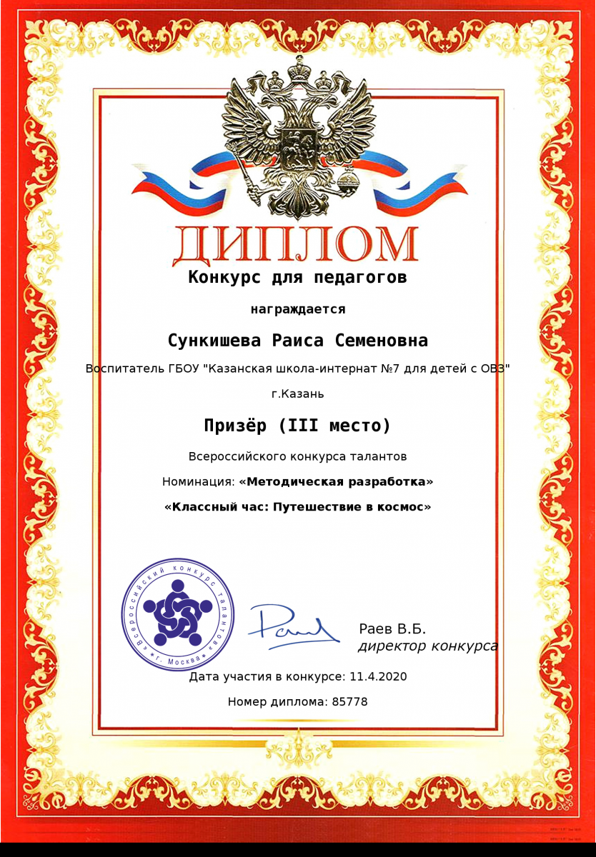 Диплом за 1 место во всероссийском конкурсе талантов "Открытый урок" Шакировой Дианы Рустамовны
