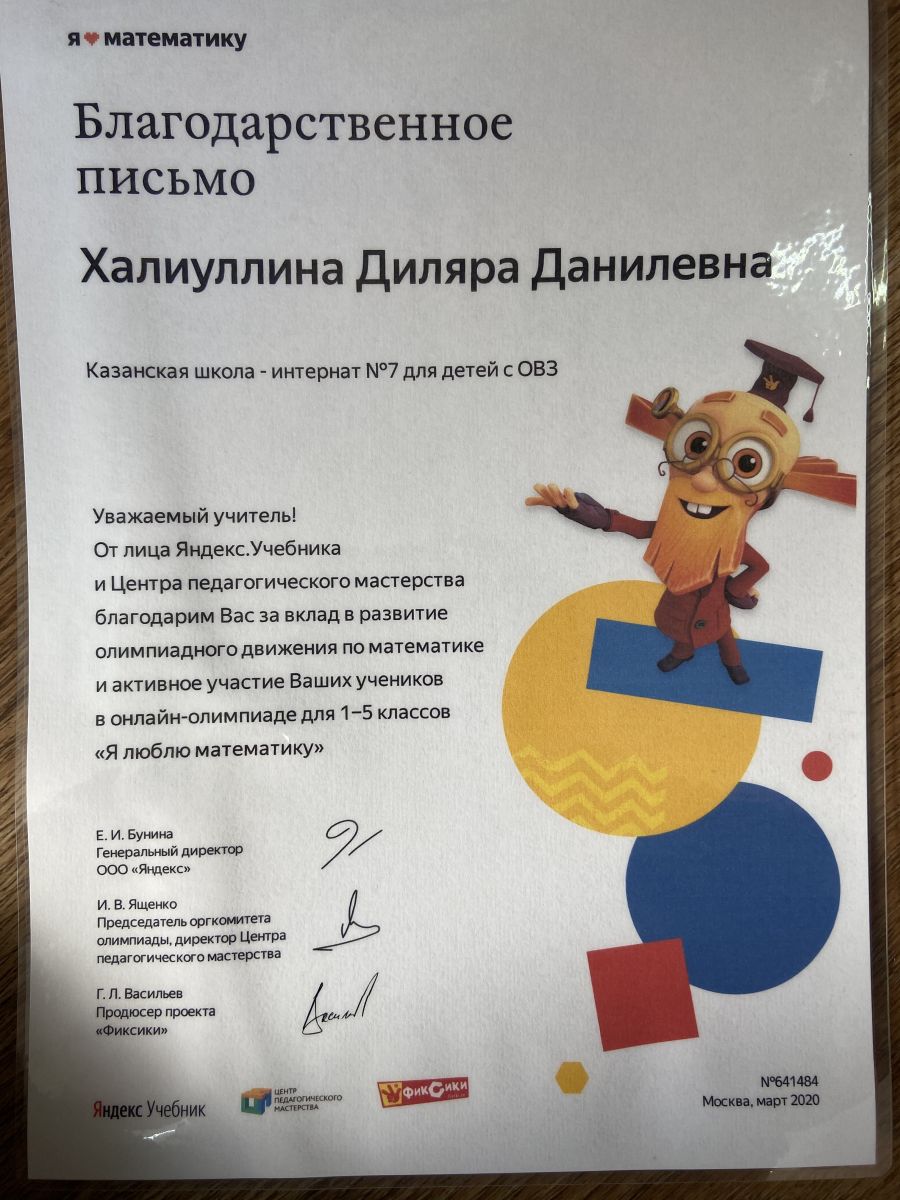 Диплом III степени педагога Халиуллиной Диляры Данилевны за подготовку ученика 2 класса Ульянова Данила Денисовича по международной дистанционной олимпиаде по математике