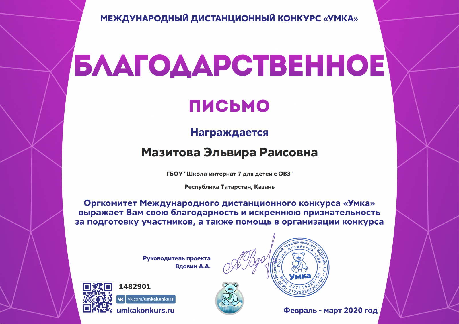 Благодарственное письмо за подготовку участников Мазитовой Эльвире Раисовне