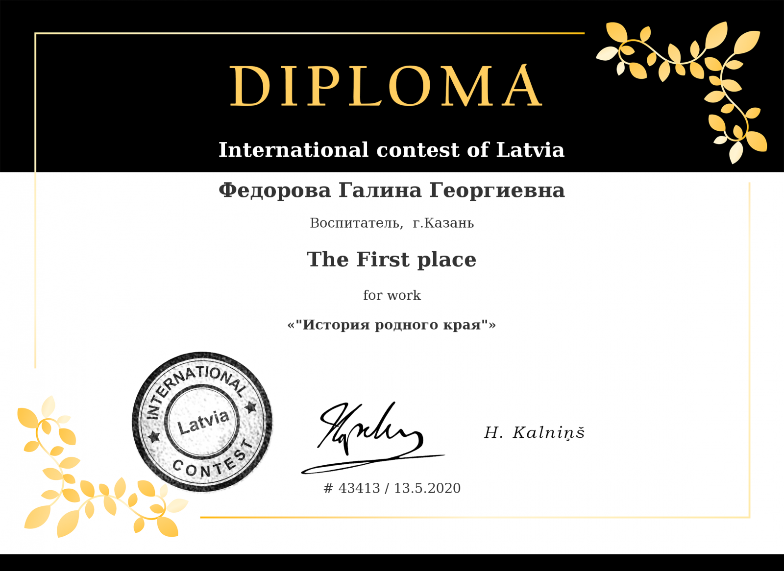Диплом за 1 место "История родного края" Федоровой Галины Георгиевны