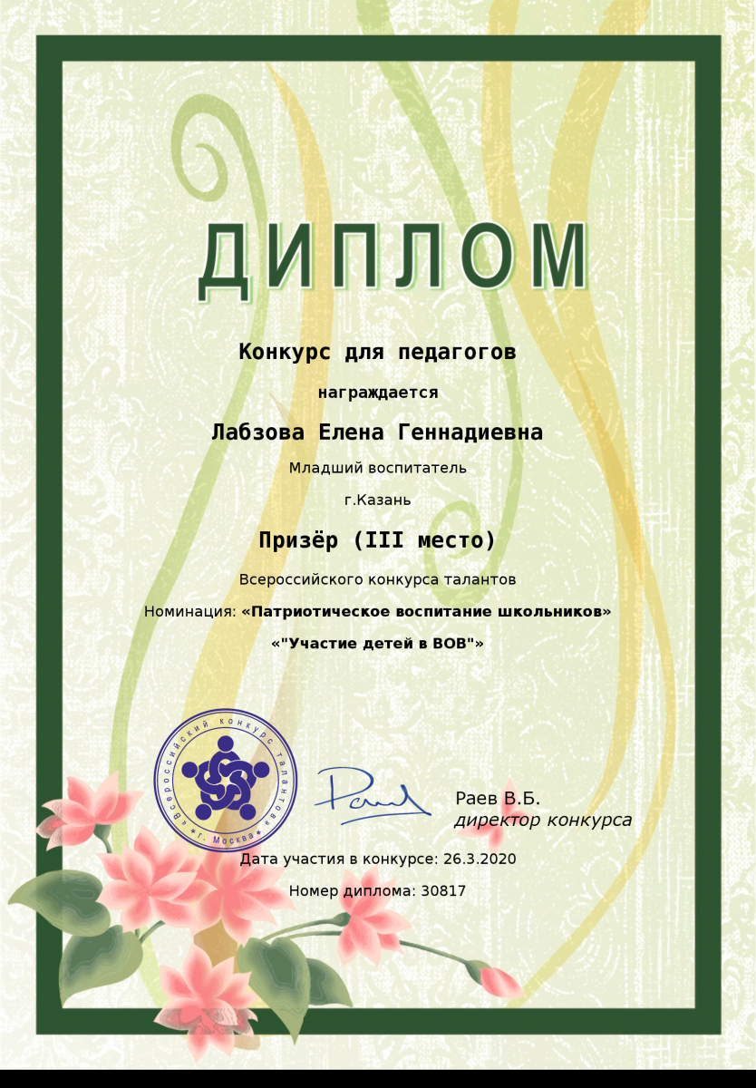 Диплом за 1 место во всероссийском конкурсе "День Победы" Шакировой Дианы Рустамовны