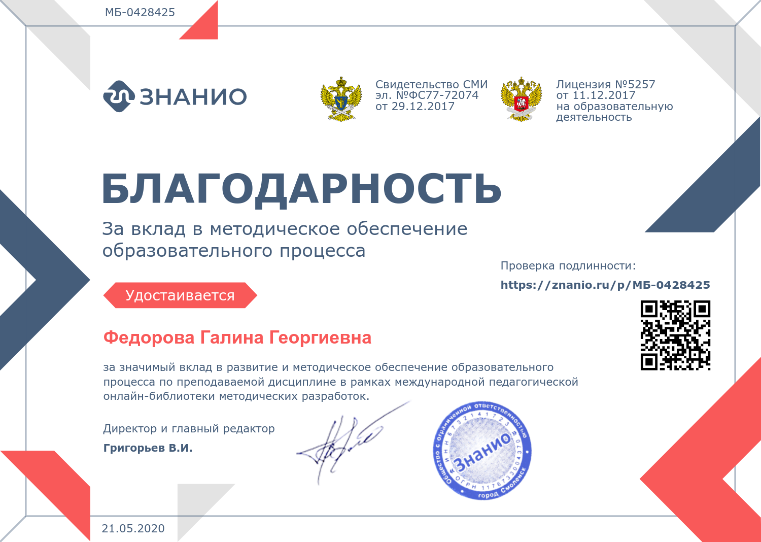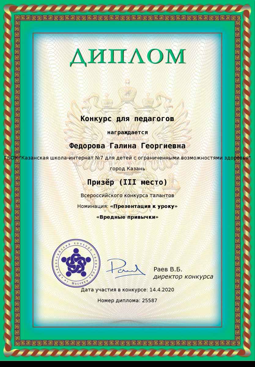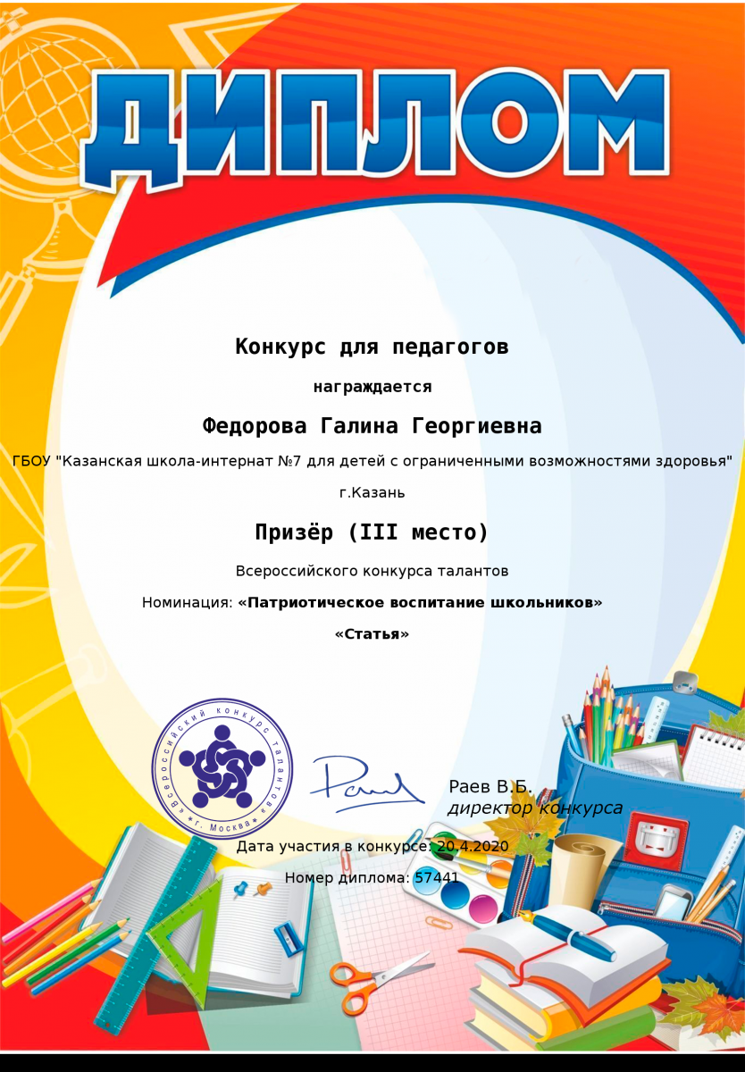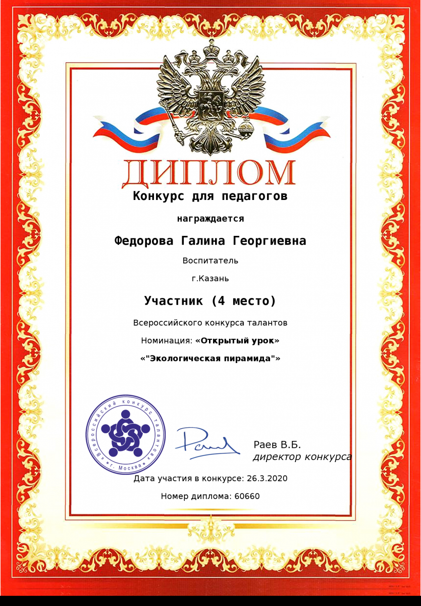 Диплом за 4 место во всероссийском конкурсе талантов "Открытый урок" Федоровой Галины Георгиевны