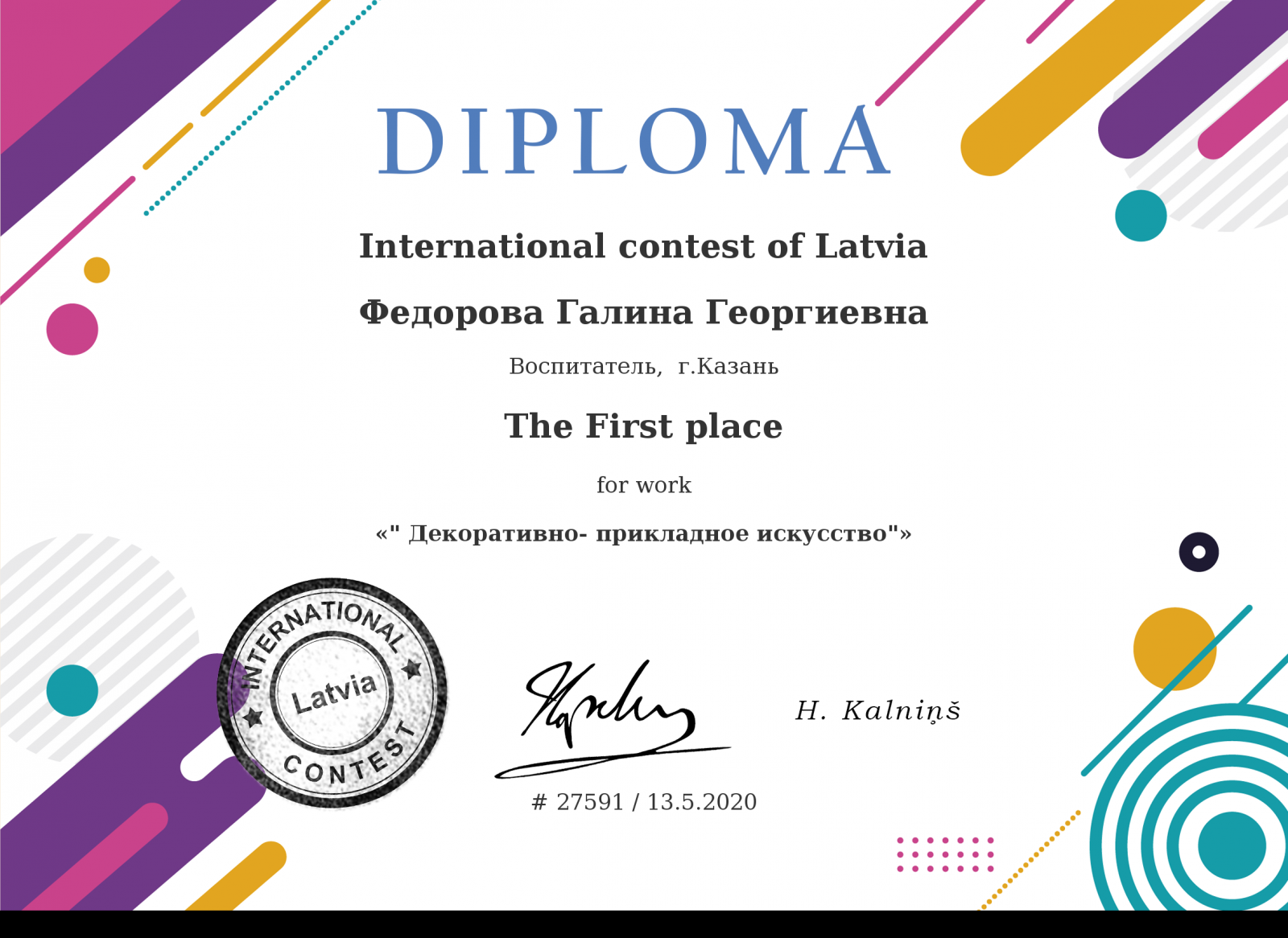 Диплом за 1 место "Декоратино-прикладное искусство" Федоровой Галины Георгиевны
