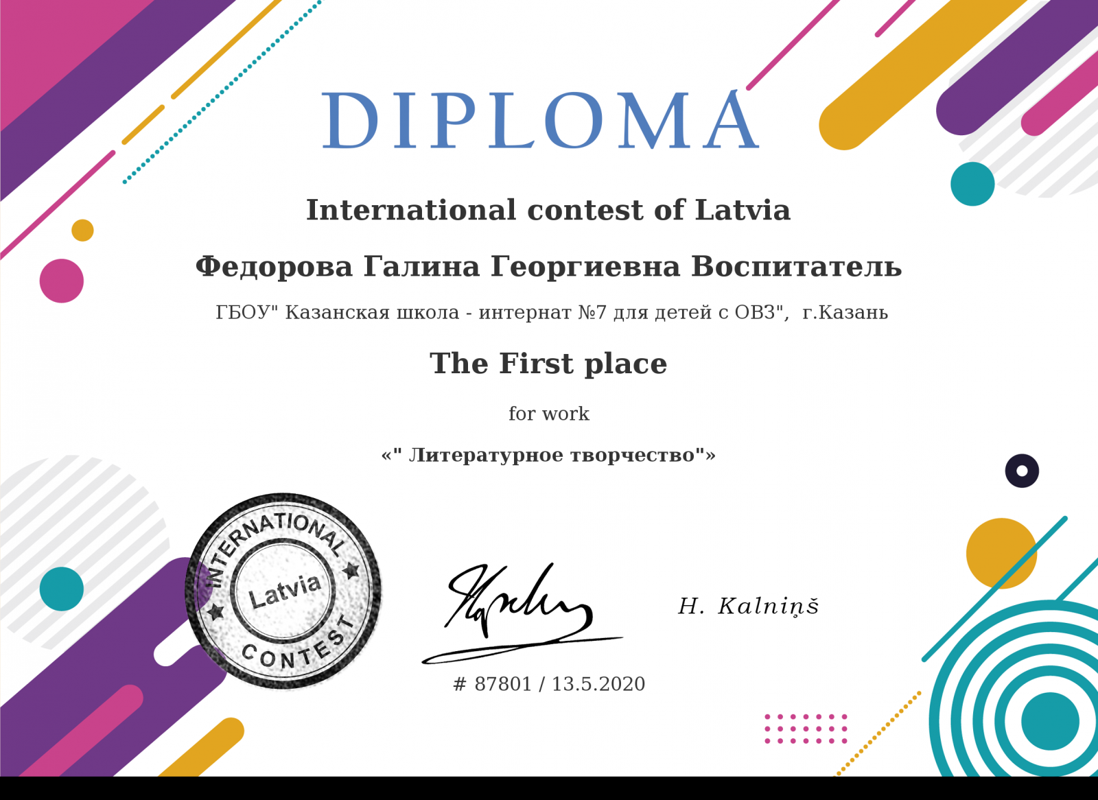 Диплом за 1 место "Литературное творчество" Федоровой Галины Георгиевны