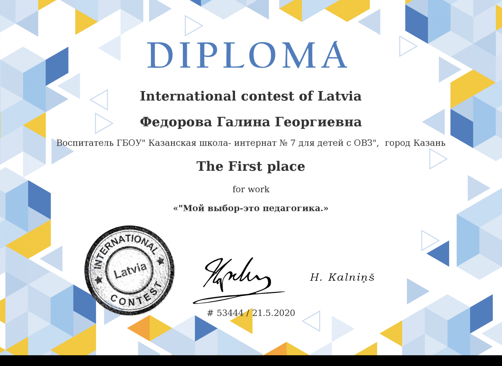 Диплом за 1 место "Мой выбор - это педагогика" Федоровой Галины Георгиевны