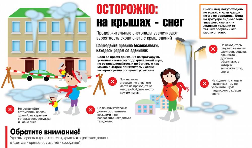 Администрация школы напоминает о том, что в зимнее и весеннее время на крышах зданий может скапливаться большое количество снега, а также могут образовываться сосульки. Обильные снегопады и последующее потепление приводит к тому, что слежавшийся снежный покров под воздействием влажности становится в 3 раза тяжелее. Поэтому одной из сезонных проблем на улицах города становится сход снега с крыш зданий и падение сосулек, что представляет большую угрозу для прохожих. Находясь в опасной зоне, человек может получить от падающего снега, ледяной массы и сосулек очень тяжелые и опасные травмы, и даже погибнуть. Чтобы избежать травматизма, необходимо помнить о соблюдении правил нахождения вблизи жилых домов и зданий.