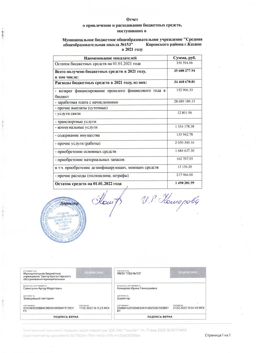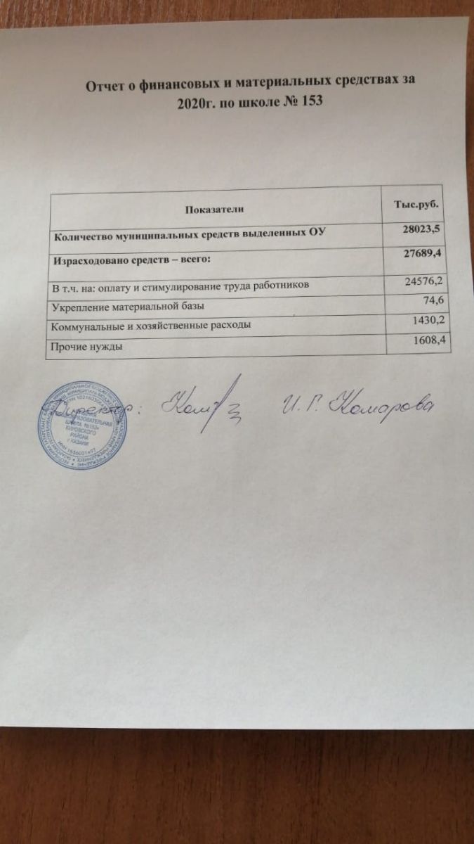Отчет о финансовых и материальных средствах за 2020г. по школе № 153