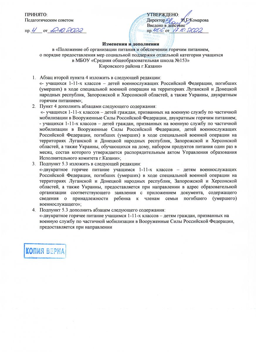 Изменения и дополнения в Положение "Об организации питания в МБОУ "СОШ №153" от 17.10.2022