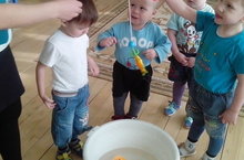 Бүген кечкенәләр төркемендә тәрбияче Рәфидә Рәфәгатовна балаларны су һәм аның үзенчәлекләре белән таныштырды. Нәниләр суда балык, үрдәк уенчыкларын йөздерделәр. Су ага, балык йөзә, үрдәк йөзә дигән җөмләләр төзергә өйрәнделәр.