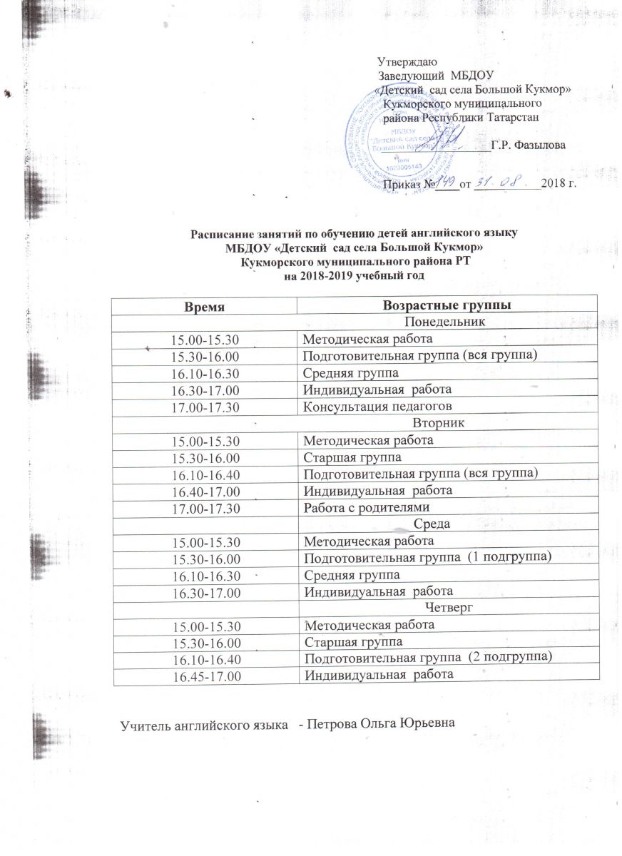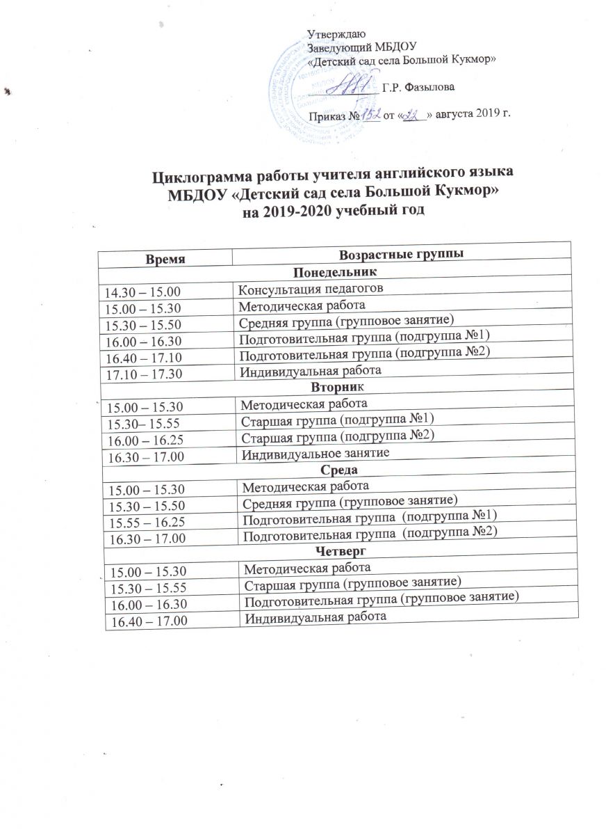 Циклограмма занятий по обучению детей английскому языку на 2019-2020 учебный год
