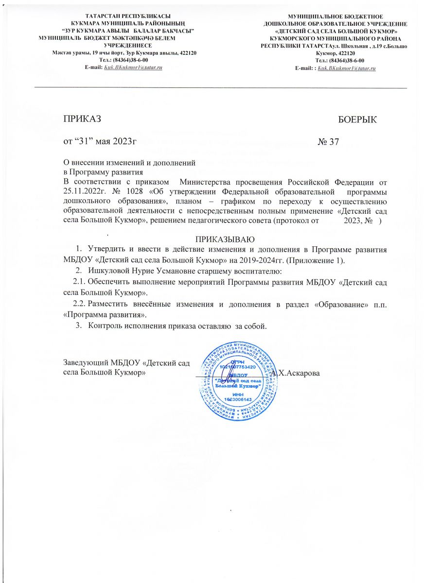Приказ о переходе к осуществлению образовательной деятельности с непосредственным полным применением ФОП ДО в МБДОУ «Детский сад села Б.Кукмор»