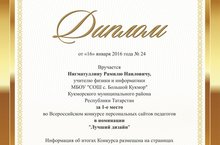 Учитель физики и информатики нашей школы Нигматуллин Рамиль Наилович во Всероссийском конкурсе персональных сайтов педагогов в номинации "Лучший дизайн" занял первое, в номинации "Лучший информационный сайт" занял второе место.