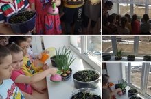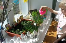 В детском саду ребята организовали небольшой огородик на подоконнике; здесь ведутся наблюдения за ростом луковиц, рассадой цветов.