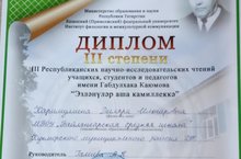 Укучыбыз Каримуллина Диләрә "Эзләнүләр аша камиллеккә" III республикакүләм фәнни-эзләнү укуларында катнашып,III дәрәҗәле Дипломант булды.