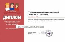 Укучыларның интернет куркынычсызлыгы белемнәрен үстерү максатыннан «Сетевичок»(www. Сетевичок.рф) проекты эшләп килә. Мәктәбебез укучысы Гиззатуллина Алинә, проект кысаларында узган бәйгедә катнашып, уңышлы чыгыш ясады. -