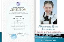 Поздравляем Абдуллину Дину Василовну- призера регионального этапа всероссийской олимпиады школьников по экологии.Желаем успехов и благополучия!