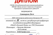 Ученица 10-го класса Саттарова Диля заняла 2-е место на республиканском конференции исследовательских работ "Мое Я в Большой науке" им. Р.И.Утямышева в номинации "Экологи, биология" (рук-ль Гарифуллина Ф.Ш.). Поздравляем!!!