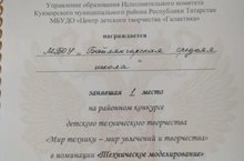 МБОУ "Байлянгарская средняя школа" награждена Грамотой Управления образования Исполкома Кукморского муниципального района РТ за 1 место на районном конкурсе детского технического творчества "Мир техники- мир увлечений и творчества" в номинации " Техническое моделирование".