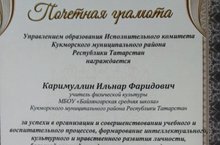 Почетной Грамотой Управления образования Исполкома Кукморского муниципального района РТ награжден учитель физкультуры Каримуллин Ильнар Фаридович.Пусть дальнейший путь Вам уготовит светлое счастье, великий успех и большие победы!