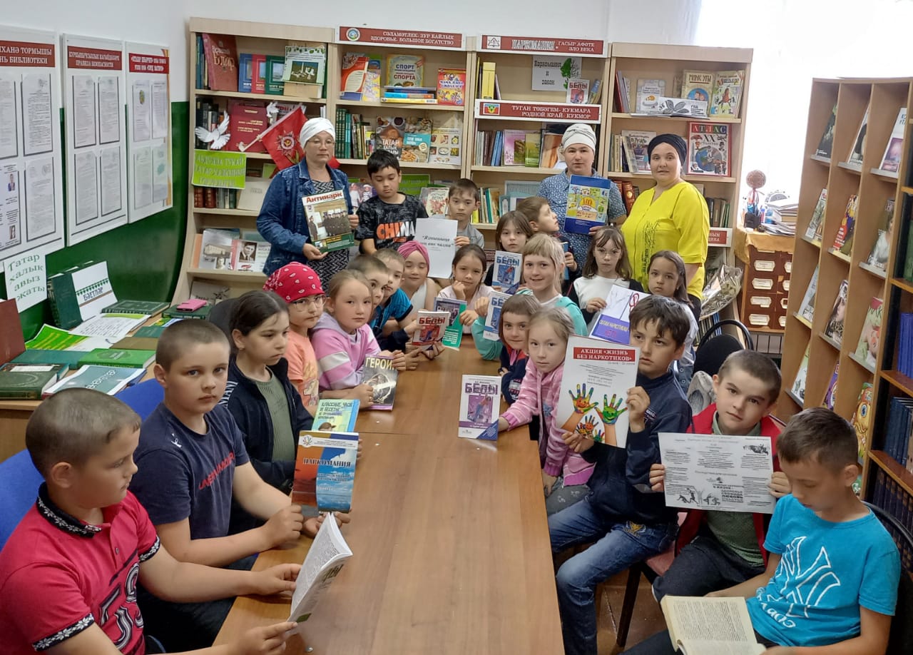 Авыл китапханәсендә “Без наркотикларга каршы” дигән темага китапханәче Сабирзянова Г.С. мәктәп яны лагерында тәрбияләнүче балаларга әңгәмә үткәрде.