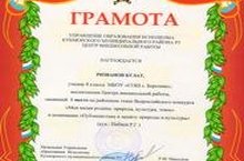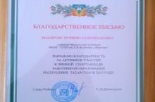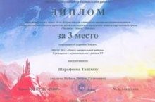 Ученица 9 класса, Шарафиева Тансылу награждена дипломом за III место на республиканском этапе 16-ой Всероссий ской олимпиады научно-исследовательских проектов по проблемам защиты окружающей среды "Человек - Земля - Космос". Руководитель - учитель биологии Набиев Расиль Газизович. Поздравляем !
