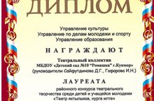 В пятницу в РДК г. Кукмор были подведены результаты районного конкурса “Театр яктылыкка, нурга илтә”. Театральный коллектив нашего детского сада под руководством Сайфутдиновой Д.Г., Гафаровой И.Н. стал Лауреатом в номинации "Оригинальная постановка". Поздравляем, желаем творческих успехов!