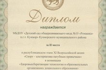 В 2014-2015 учебном году МО и Н РТ был организован республиканский этап XI Всероссийской акции "Спорт - альтернатива пагубным привычкам". В ходе республиканского этапа был объявлен конкурс на лучшую постановку работы по данному направлению. В соответствии с приказом МО и Н РТ от 25.03.2015г. №1926/15 коллектив нашего детского сада занял 2 место в номинации "Здоровьесберегающие технологии в образовательных организациях дошкольного образования". Поздравляем сотрудников МБДОУ с этой победой!