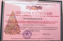 30 декабрьдә Кукмара шәһәренең Комсомол мәйданында "Шәһәрнең мәктәпкәчә белем бирү учреждениеләре объектлары фасадын һәм аның янәшәсендәге территорияне Яңа елга иң яхшы бизәү" конкурсына йомгак ясалды. Безнең балалар бакчасы 2 нче дәрәҗә диплом белән бүләкләнде. Яңа Елга балалар бакчасы территориясен бизәүдә ярдәмнәре өчен тәрбияләнүчеләрнең ата-аналарына һәм хезмәткәрләренә рәхмәт сүзләрен җиткерәбез.