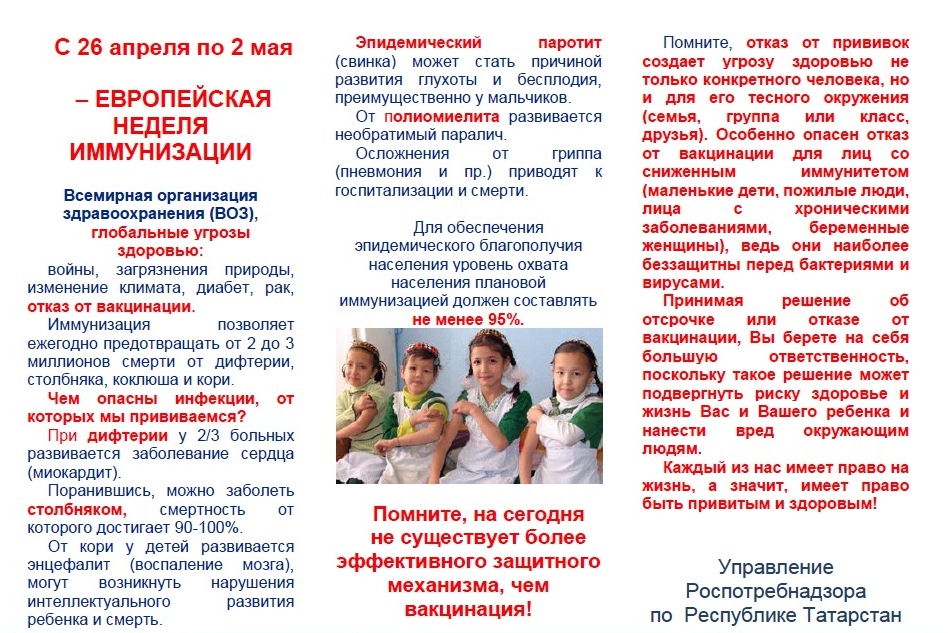 По инициативе Всемирной организации здравоохранения в Европе, в том числе в Российской Федерации и Республике Татарстан, в период с 26 апреля по 2 мая 2021 г. проводится Европейская неделя иммунизации. Основная цель ЕНИ - 2021 - повышение уровня знаний населения о важности иммунизации в предупреждении инфекционных заболеваний. << ПАМЯТКА >>