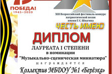 Коллектив детского сада принял участие во всероссийском фестивале-конкурсе "Честь имею", посвященном 75-летию Победы в Великой Отечественной войне 1941-1945 гг. По итогам фестиваля коллектив награжден Дипломом 1 степени в номинации "Музыкально-сценическая миниатюра". Администрация детского сада выражает благодарность Сайфутдинову З.А., родителю воспитанника подготовительной к школе группы, за активное участие в фестивале. Поздравляем!