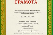 Балалар бакчасында тәрбияләнүчеләр "Бозда һәм суда сак булырмын" дигән балалар рәсеменең муниципаль конкурсында актив катнаштылар. Конкурс нәтиҗәләре буенча Мортазин Т. 2 урын өчен призер грамотасы белән бүләкләнде. Котлыйбыз!!!