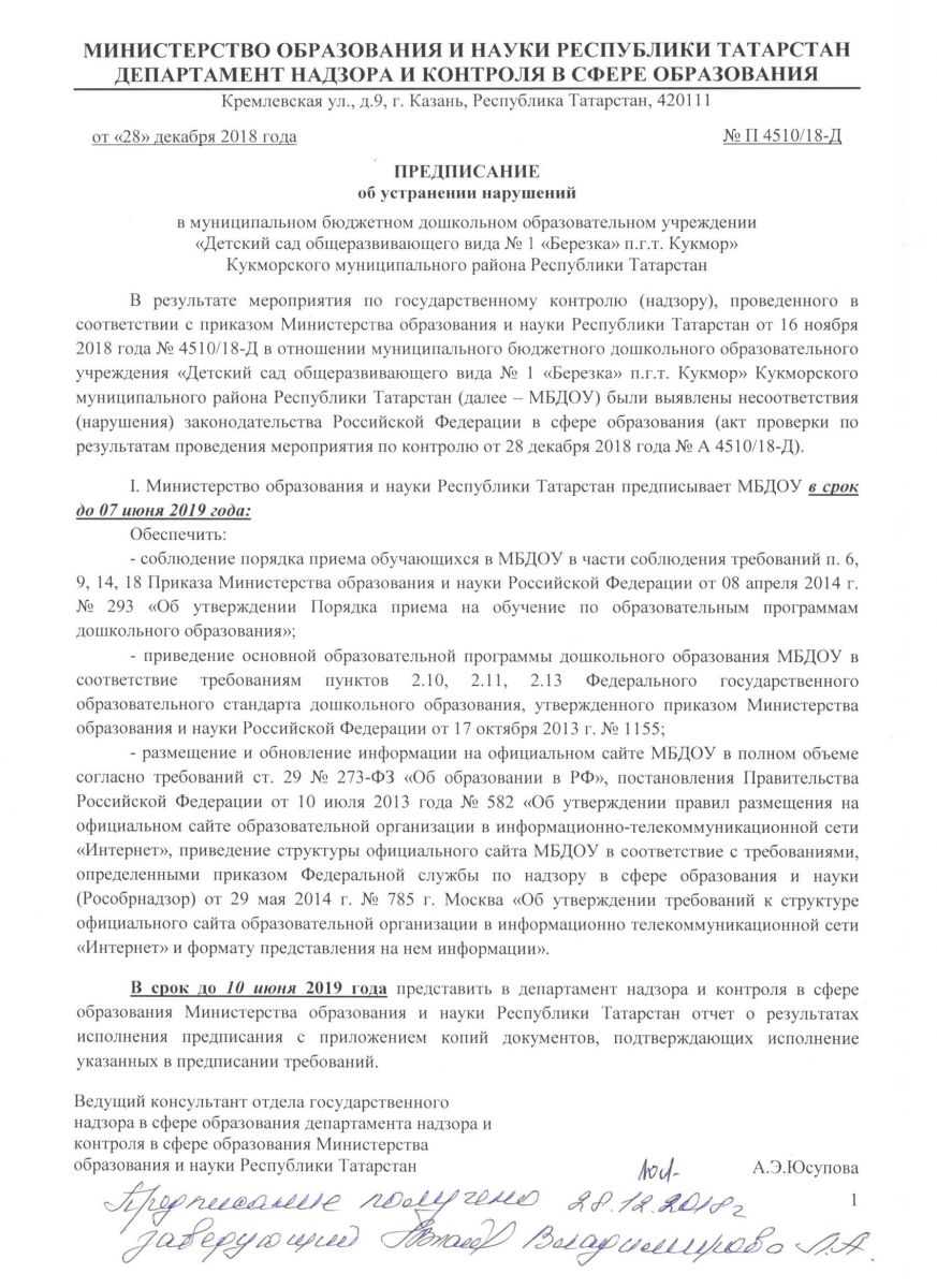 Предписание об устранении нарушений МО и Н РТ, Департамента надзора и контроля в сфере образования