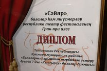 27 ноябрь көнне Казанда Яңа Савин районының 179-нчы номерлы гимназиясе базасында "Сәйяр" республика фестиваль-конкурсы җиңүчеләрен һәм призерларын бүләкләү тантанасы узды. Бу чарада безнең мөдир Гобәйдуллина Рузалия Аглиулла кызы да катнашты: чөнки безнең балалар бакчасы Гран-прига лаек булды! Ә бу җиңүгә тәрбиячеләр Степанова Р. С. һәм Галимуллина Ф. Ф. зур өлеш керттеләр. Барлык коллектив исеменнән аларны зур җиңүләре белән котлыйбыз!