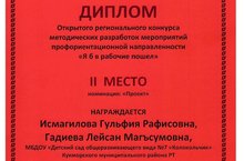 МБУ "Информационно-методическим центром" г.Набережные Челны совместно с МАУ ДО "Городской дворец творчества детей и молодежи №1" г.Набережные Челны был проведен Открытый региональный конкурс методических разработок, мероприятий профориентационной направленности "Я б в рабочие пошел", в котором приняли участие и воспитатели нашего дошкольного учреждения (Исмагилова Г.Р., Гадиева Л.М.) и были удостоены 2 места в номинации "Проект".
