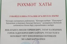 Безнең балалар бакчасының мөдире Гобәйдуллина Рузалия Аглиулла кызы бүген Кукмара районы башлыгы тарафыннан яшь буынга милли тәрбия бирү, татар халкының гореф-гадәтләрен кире кайтару, туган телгә мәхәббәт уяту юнәлешендә нәтиҗәле эш алып барганы өчен рәхмәт хаты белән бүләкләнде.