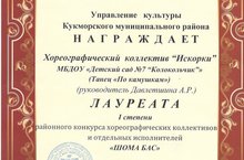 Безнең балалар бакчасының "Искорки" бию төркеме (җит.Давлетшина А.Р.) "Шома бас" районкүләм бию бәйгесендә 1 дәрәҗәдәге лауреат исеменә лаек булды. Кечкенә йолдызларыбызны шушы җиңүләре белән котлыйбыз, алга таба да зур уңышларга ирешүләрен теләп калабыз!
