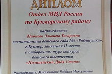 Отдел МВД России по Кукморскому району провел отборочный тур конкура детского творчества "Полицейский Дядя Степа", наша воспитанница Эльвина Н. заняла почетное 2 место (руководитель Мухаметова Р.М.). Поздравляем!!!