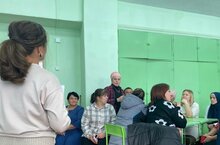 Встреча учителей и учеников в спортзале. Накануне состоялась игра в волейбол, победу в которой со счетом 2:1 одержали учителя.