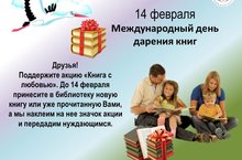 14 февраля "Международный день дарения книг". Присоединяйтесь к акции "Подари книгу библиотеке". Пусть ваши книги станут доступны другим детям!