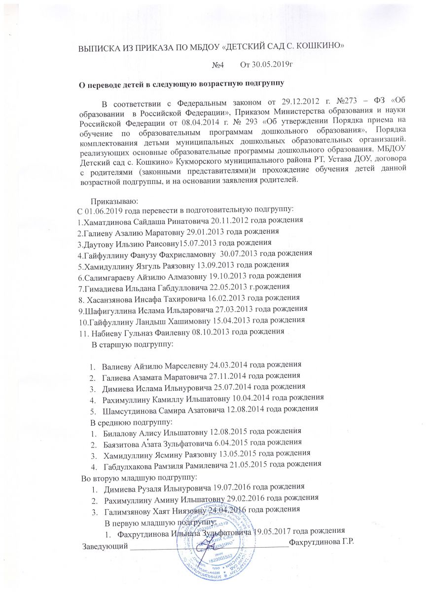 Выписка из приказа о переводе в другую возрастную подгруппу