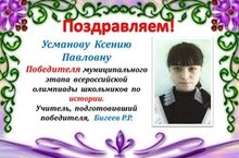 Усманова Ксения, ученица 9 класса, стала победителем муниципального этапа всероссийской олимпиады школьников по истории (учитель Бигеев Р.Р.) Поздравляем! Молодец! Желаем дальнейших успехов.
